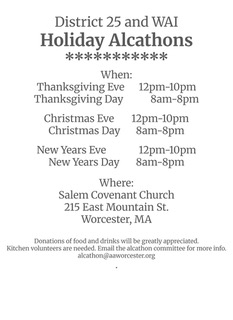 Wednesday December 24 & 31 12-10pm and Thursday December 25 & January 1 8am-8pm. For inquiries email alcathon@aaworcester.org