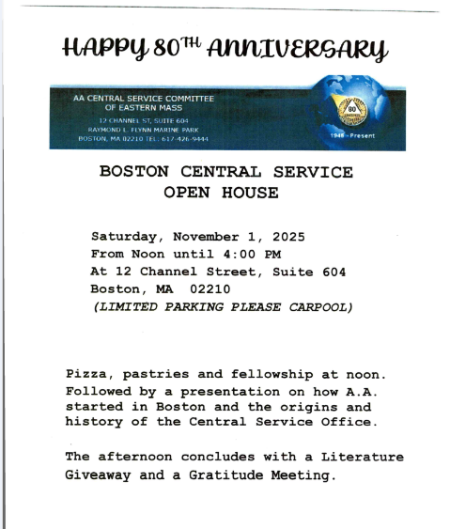 Boston Central Service Committee (CSC) 80 years Open House celebration, noon-4 pm Saturday November 1, 12 Channel Street Suite 604 Boston MA. Pizza, literature raffle.