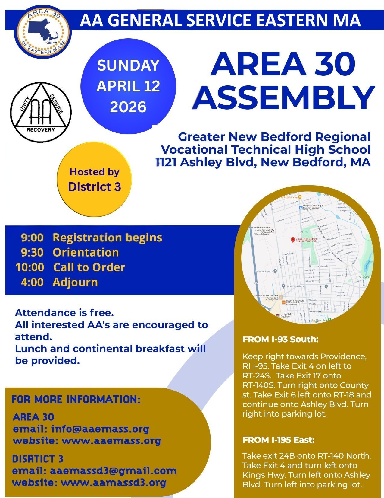 Area 30 Assembly, hosted by District 3 Sunday April 12.