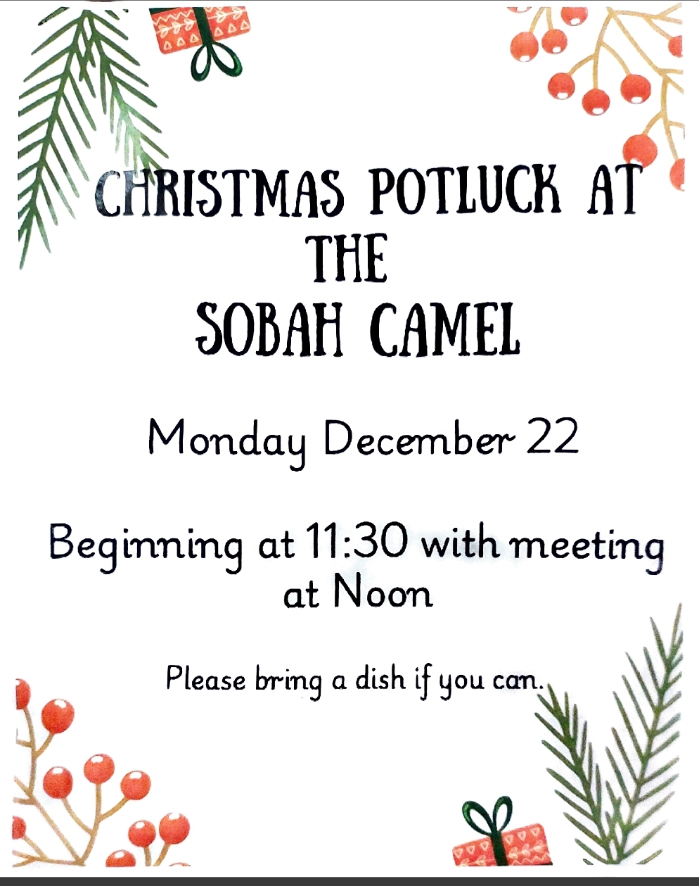 Sobah Camel Potluck at Monument Hall Concord MA. Food at 11:30, meeting at noon. Food donations welcome.