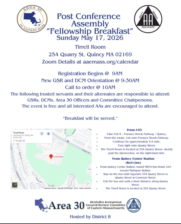 Sat May 2 District 25 Roundup8am-3pm, St Anne's Church, Rt 9 Shrewsbury. Tix $15. Breakfast & lunch included, see flyer for d ... (more) Thu May 14 WAI Delegates MeetingThursday May 14 7pm, Salem Covenant church and on Zoom ... (more) Sun May 17 Post Conference AssemblyPost Conference Assembly Sunday May 17, 10am-3pm. Location: Tirrell Room, 254 Quarry St, Quincy MA ... (more) Thu May 21 Dudley Day At A Time 53rdDudly Day At A Time anniversary, Thursday May 21 6:30-9:30 pm. See ... (more) |