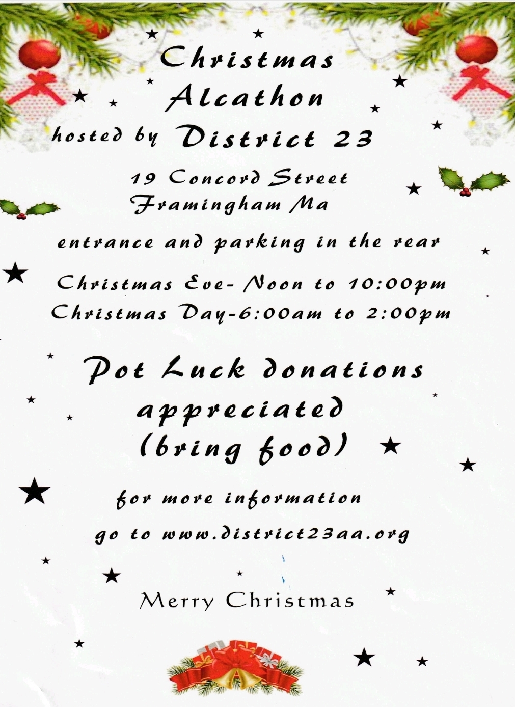 Nov 14-16 MA State ConventionMA State Convention Nov 14-16, Best Western Plaza, Marlboro MA. For details visit ... (more) Thu Nov 20 Hopkinton Freedom 42ndFaith Community, 146 E. Main St. Hopkinton. Food at 6 pm followed by guest speakers. Sun Nov 23 District Service Appreciation4-6 PM Sunday November 23, How It Works Clubhouse, Bellingham. ... (more) Tue Dec 9 7:30 District MeetingGSR meeting 7:30pm Tuesday December 9. ... (more) Holiday Alkathon Dec 24 & 2519 Concord street Framingham. See flyer for details. ... (more) |