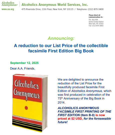 A reprint of Alcoholics Anonymous first edition book is now $2 from aa.org