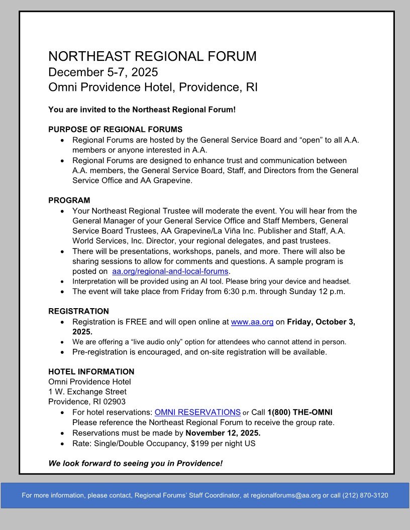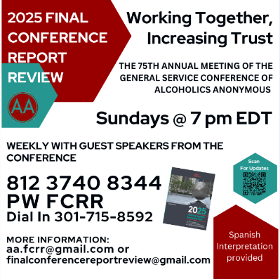 A weekly review of the 75th General Service Conference Report is being held Sundays, 7 pm EST via Zoom. See flyer for details.
